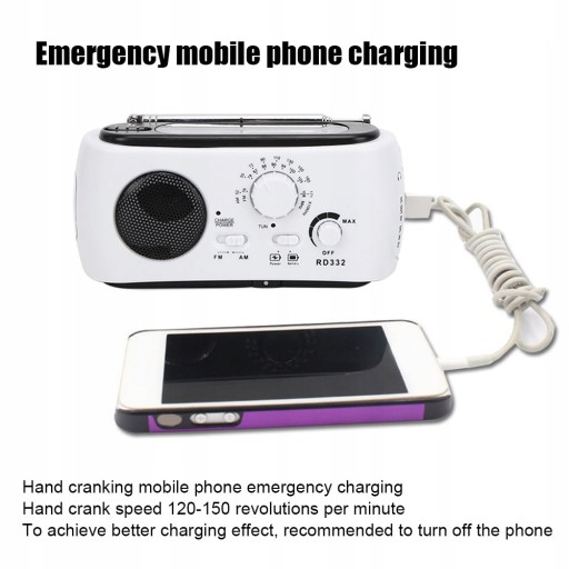 4. Korba ręczna generuje energię elektryczną, otwiera korbę ręczną, 120-150 obrotów na minutę, może ładować wbudowaną baterię litową.