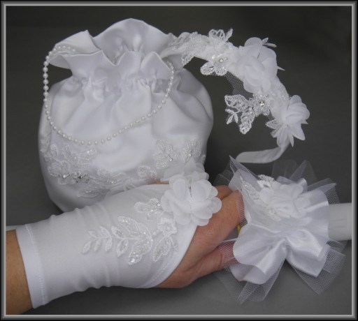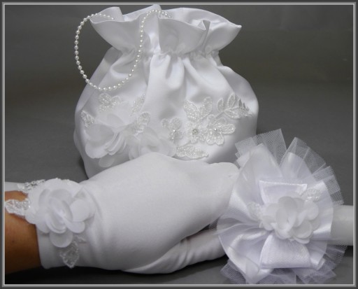 Urocza torebka komunijna w kształcie woreczka. Ozdobiona koronkową aplikacją 3d z szyfonowymi kwiatkami. Na pozostałych aukcjach można do niej dokupić rękawiczki zakładane na jeden paluszek lub pięciopalczaste oraz okapnik na świecę komunijną. Torebka wykonana została z satyny ślubnej pierwszego gatunku i posiada sztywną wkładkę pomagającą w zachowaniu kształtu woreczka nawet po obciążeniu.