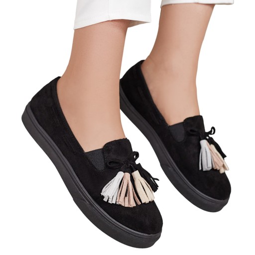 Klasyczne damskie mokasyny na płaskiej podeszwie. Model jest wykonany ze skóry ekologicznej zamszowej i tkaninowej wkładki. Posiada frędzelki na nosku. Idealna baza na co dzień!