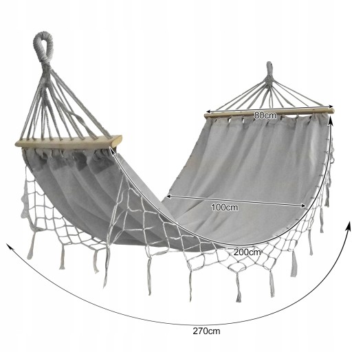 ✓ SPECYFIKACJA - kolor: szary; materiał: bawełna, poliester; maksymalne obciążenie: 200 kg; długość stelaża drewnianego: 80 cm; wymiary materiału (dł/szer): 200 x 100 cm; długość całości: 270 cm; waga: 1,4 kg; waga w opakowaniu: 1,6 kg.