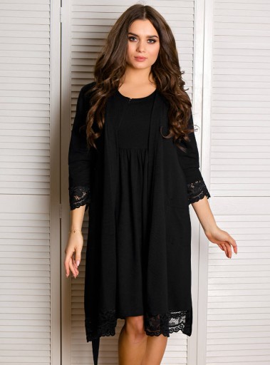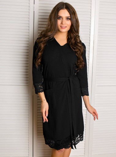 CZARNY BAWEŁNIANY SZLAFROK GRACE - KORONKA