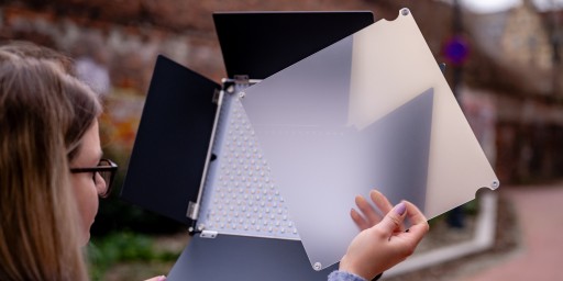 W zestawie znajdziesz również stelaż softboxa, grid oraz tkaninę dyfuzyjną. Akcesoria zainstalujesz na wrotach za pomocą specjalnych opasek z rzepami. Tkanina dyfuzyjna pomoże skutecznie zmiękczyć światło i rozmyć ostre cienie. To jednak nie koniec możliwości zestawu. Grid (zwany również plastrem miodu) pozwoli dodatkowo ograniczyć kąt emitowanego światła i lepiej je ukierunkować.