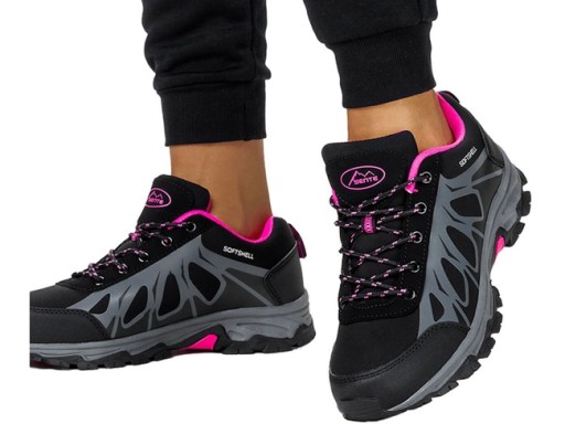 OBUWIE TREKKINGOWE DAMSKIE SOFTSHELL CZARNE SZNUROWANE RÓŻOWE DODATKI