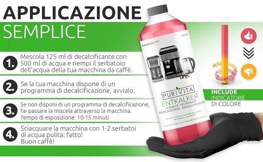 Kompatybilny z: DeLonghi Siemens Saeco Senseo Tassimo Cafissimo Tchibo Melitta AEG Bosch Dolce Dusto Philips Nespresso Gaggia Jura Lattissima Krups Miele Magnifica Moccamaster Petra Russell Hobbs. Odkamieniacz kompatybilny ze wszystkimi automatycznymi ekspresami do kawy na saszetki, kawą espresso z filtrem, a także ekspresami z uchwytem na filtr i wszystkimi urządzeniami gorącej wody do dokładnego usuwania kamienia. Nasz odkamieniacz jest łatwy w użyciu, dokładnie czyści i oszczędza pieniądze. Jest również delikatny dla skóry i ma dobrą wydajność. Szanuje materiał i dba o Twoje urządzenia parowe i czajniki. Wyprodukowane w Niemczech. Chroni przed osadzaniem się kamienia, który wpływa na wydajność i smak. Ponadto płyn przeciw osadzaniu się kamienia o dużej sile odkamieniania można stosować również do łazienek, ceramiki sanitarnej, osadów z moczu czy płytek. Jest wyposażony we wskaźnik koloru cieczy, który zapewnia odnowione działanie zapobiegające osadzaniu się kamienia. Wskaźnik koloru sygnalizuje wyczerpanie się działania zapobiegającego osadzaniu się kamienia: kolor zmienia się z różowego na żółty.