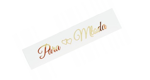 Tablica z ozdobnym tekstem udekorują samochód w dniu ślubu. Napisy wykonane metodą cięcia laserowego z plexi złote lustro i przyklejone do płyt MDF koloru białego.