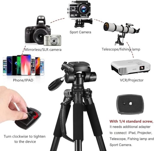 - Szeroka kompatybilność. Ten statyw Joilcan ze standardową śrubą 1/4" nadaje się do wszystkich kamer DSLR, iPadów, kamer internetowych, punktów, lornetki i telefonów komórkowych. Uchwyt na telefon komórkowy obracany o 360 stopni, jest idealny do YouTube, transmisji strumieniowej na żywo, robienia selfie itp.