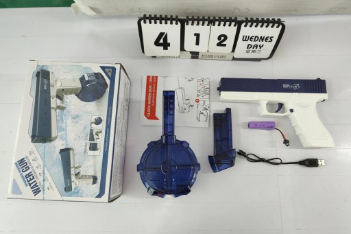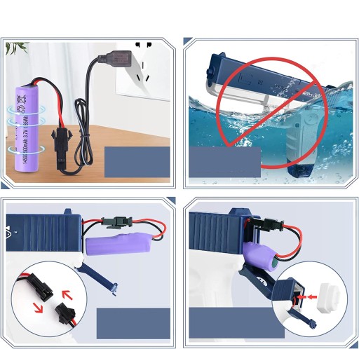 - 🌊Nazwa: Automatyczny pękający elektryczny pistolet na wodę + bateria litowa 500 mah 3,7 V + dwa wkłady wodne + kabel USB