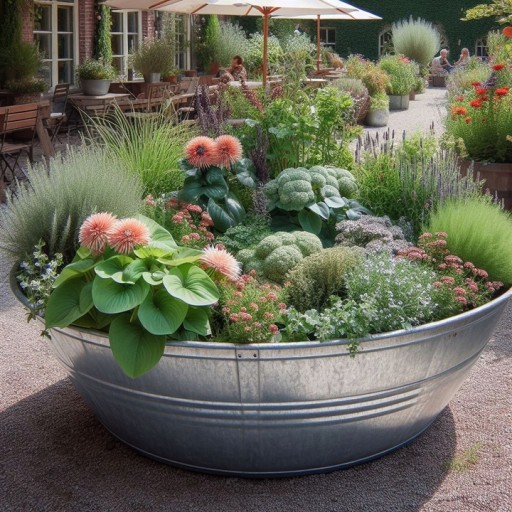 Przykład aranżacji ogrodowej z wykorzystaniem miski ocynkowanej wykreowany przez sztuczną inteligencję. Podobne kompozycje mogą zagościć i w Twoim ogrodzie.
