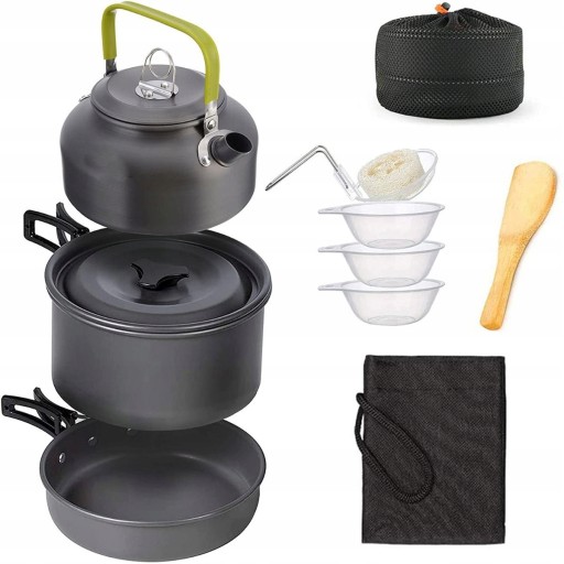 - Przenośne: Składane uchwyty na garnku lub kuchence można złożyć, aby zaoszczędzić miejsce. Małe i przenośne, wszystkie elementy tego zestawu do gotowania mogą być przechowywane razem w torbie z siatki do wygodnego transportu.