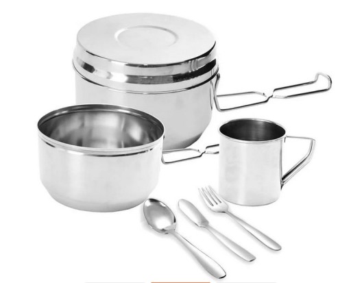 Praktyczny komplet lekkich naczyń kempingowych wykonanych z stali nierdzewnej, przyda się podczas każdej wyprawy turystycznej, zarówno długiej jak i krótkiej - w kajaku, na łodzi, na wyprawach trekingowych, wypadach górskich, czy biwakach. Posłuży do przygotowania posiłku turystycznego. Można go spakować do plecaka, lub też wrzucić do szafki kuchennej na kempingu. Najważniejszym atutem jest kompaktowość zestawu - schowamy garne mniejszy i kubek w jeden moduł. W plecaku zajmuje niewiele miejsca, a dzięki swojej lekkości, nie odczujemy do prawie podczas marszu. Składane rączki, ułatwiają pakowanie, a rączka większego garnka trzyma przykrywkę po złożeniu. Sztućce, niestety musimy schować oddzielnie.
