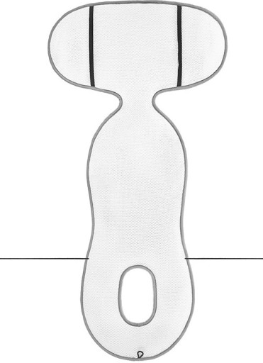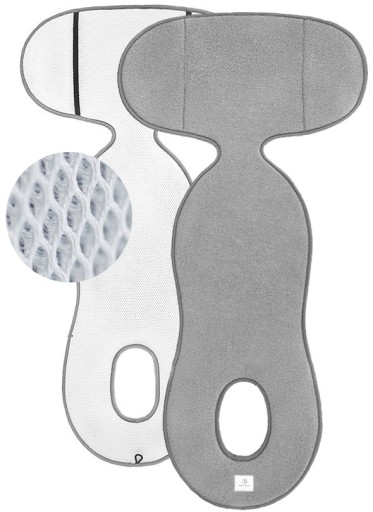 Wkładka posiada dwa systemy mocowań: szerokie gumy na zagłówek oraz długie gumko-sznurki do przewiązywania pod fotelikiem. Nawet po wysunięciu zagłówka wkładka zapobiega poceniu się pleców. Dodatkowo wkładka posiada duże wycięcie na pasy wygodne przy naciąganiu.