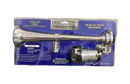 Wysokiej jakości profesjonalna, chromowana, pneumatyczna fanfara z kompresorem w zestawie, przystosowana do instalacji o napięciu 12V.