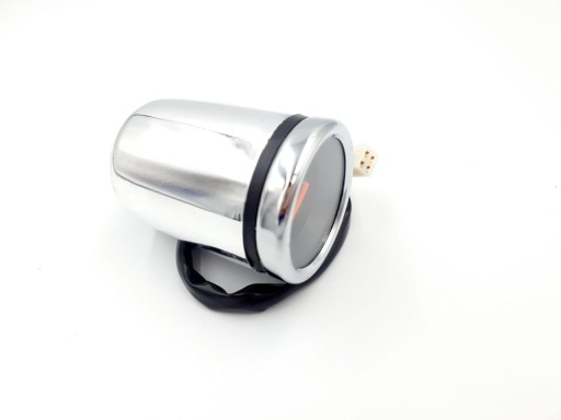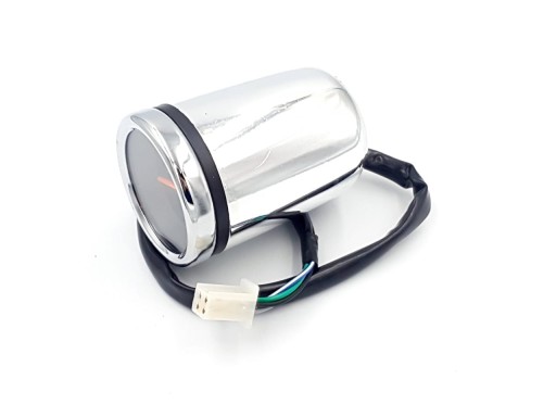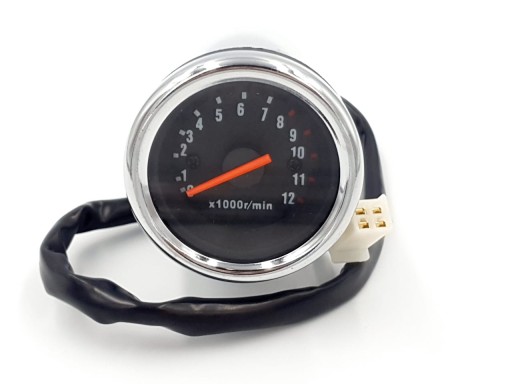 Nowy chromowany obrotomierz wskazówkowy zasilany elektrycznie mocowany na szpilkę M6. Obudowa plastikowa, przewód elektryczny zakończony kostką 4-pinową żeńską.