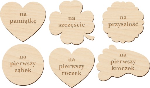 - 6 deseczek w różnych kształtach do wyboru z możliwością zmiany graweru (domyślnie wysyłamy jak na zdjęciu obok)