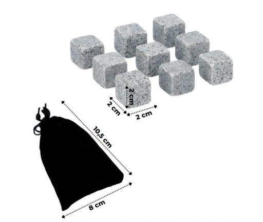 Kostki wykonano z naturalnego, niebarwionego kamienia. Kamienie do drinków to idealne rozwiązanie, schłodzą trunek, tym samym nie rozcieńczając go i nie zmieniając jego walorów smakowych.