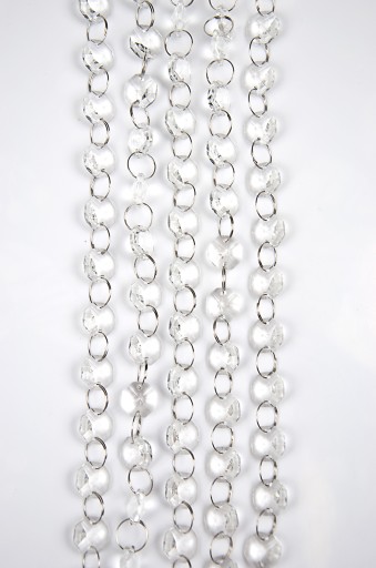 Kryształki cudownie rozpraszają światło, dodając wnętrzu szyku, elegancji i stylu. Pięknie mieniąc się w świetle dziennym jak i sztucznym, rozświetlają każde wnętrze. Połączone są cieniutkimi metalowymi kółeczkami o średnicy 12 mm, ułatwiające podpinanie zawieszek na żabkach, agrafkach i innych elementach służących do podczepiania. Kryształki są bezbarwne, obustronnie lekko stożkowate, w kształcie ośmioboku i mają średnice 15 mm.