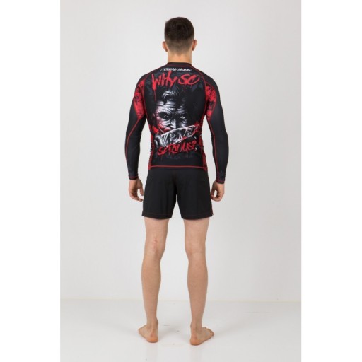 Extreme Hobby Rashguard Why So Serious Długi Rękaw - kto zna nie pamięta tej kultowej kwestii głównego antagonisty człowieka nietoperza? To właśnie arcy złoczyńca Joker stanowi motyw przewodni tej mrocznej serii odzieży do sportów walki od rodzimego producenta.
