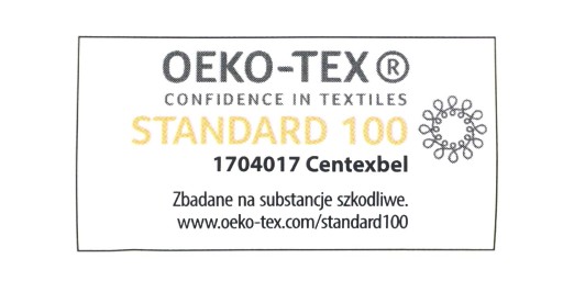 Prześcieradło posiada Certyfikat Tekstylia Godne Zaufania Oeko-Tex standard to certyfikat świadczący o jakości produktów tekstylnych i włókienniczych, które mają bezpośrednią styczność ze skórą człowieka. Certyfikat potwierdza bezpieczeństwo produktu.
