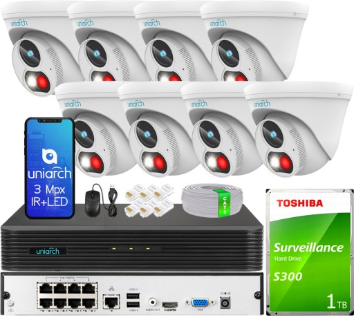 Полный IP-мониторинг для 8 камер Uniarch 3 Мп, PoE-рекордер, диск 1 ТБ