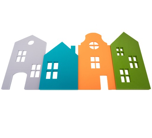 Oferujemy Państwu zestaw unikalnych akustycznych paneli wygłuszających składający się z czterech uroczych, piankowych domków - doskonałe rozwiązanie dla poprawy jakości dźwięku w pokoju Twojego dziecka.