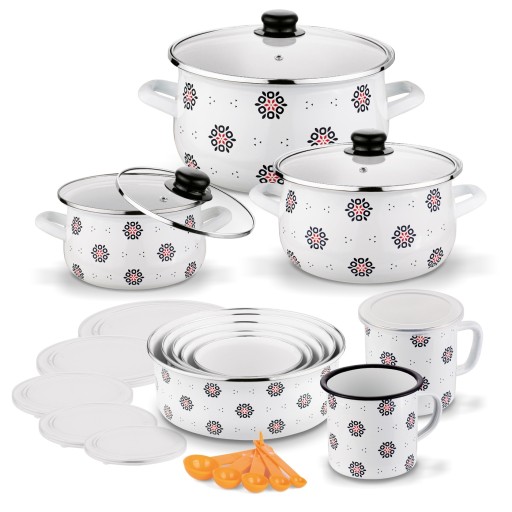 Komplet garnków emaliowanych Tadar Folklor 6 elementów składa się z naczyń o pojemności 2,1 / 3,9 / 6,4 litra. Pozwalają one bezpiecznie przechować żywność (nie zmieniają jej smaku, zapachu czy właściwości). Emalia jest trwała, odporna, antyalergiczna i antybakteryjna. Dzięki jej funkcjonalności i pokrywkom zamykającym obieg szybciej ugotujesz obiad i zrobisz duszone dania. Naczynia są ponadto wykonane ze stali. Dlatego tak dobrze znoszą wysoką temperaturę i mają odpowiednie zabezpieczenie przed odkształceniem. Ich rączki są solidne i odlewane. Uchwyt pokrywki wykonano z tworzywa wolno nagrzewającego się. Komplet garnków może pochwalić się natomiast szybką i równomierną absorpcją ciepła. W ten sposób oszczędzisz nie tylko czas, ale również energię i to na kuchenkach ceramicznych, gazowych i elektrycznych. Zestaw 5 misek emaliowanych też ma dedykowane pokrywki. Tutaj również naczynia są stalowe i trwałe. Przechowasz w nich jedzenie, także w lodówce. Wykorzystasz je również, by zabrać posiłek w podróż. Co więcej, ochronisz składniki lub resztki z obiadu przed wysychaniem, owadami i zanieczyszczeniem. Przechowasz je niewielkim kosztem miejsce oraz umyjesz bez wysiłku. Średnica misek pozwala na umieszczenie ich jedna w drugiej. Natomiast metalowe kubki emaliowane retro 500 ml i 1000 ml (także stalowe) mają ucho i atrakcyjną pojemność. Napijesz się z nich w domu lub poza nim (wszędzie i wygodnie!). Wykorzystasz je do podgrzewania jedzenia lub mleka. Bezpiecznie ustawisz je i wykorzystasz na domowej kuchence. Retro motyw ozdobny całego zestawu nawiązuje do folkloru tradycyjnego i wygląda bardzo stylowo. Oprócz tego w komplecie jest zestaw 5 miarek kuchennych. Możesz nimi precyzyjnie oraz łatwo odmierzać składniki sypkie i płynne w ilości 1,25-15 ml.