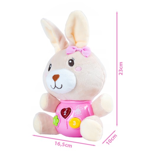 Pluszowy króliczek posiada trzy funkcyjne przyciski za pomocą, których uruchamia się dźwięki takie jak: