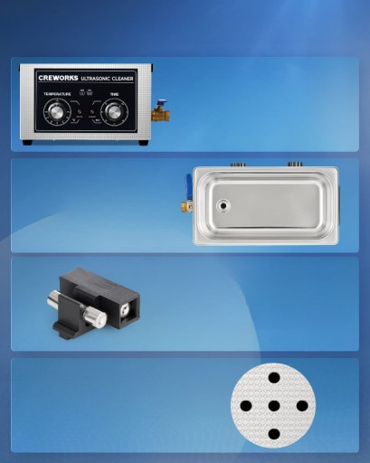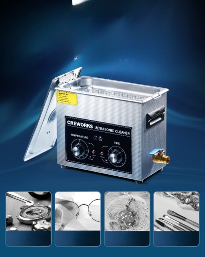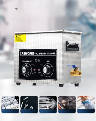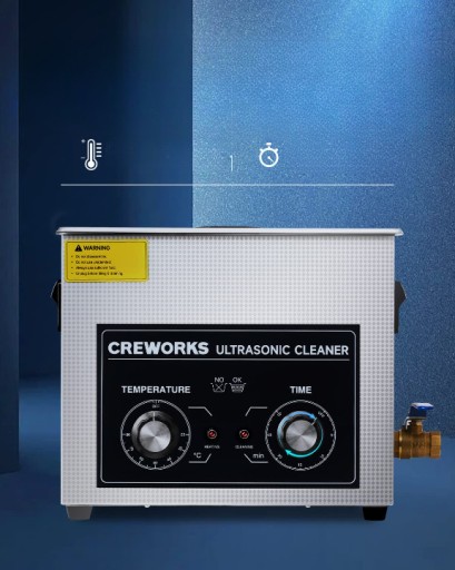 Usuwa uporczywe zabrudzenia: 6,5-litrowe urządzenie do czyszczenia ultradźwiękowego firmy CREWORKS o mocy 180 W i ogrzewaniu 200 W dokładnie czyści i może dotrzeć do trudno dostępnych miejsc.