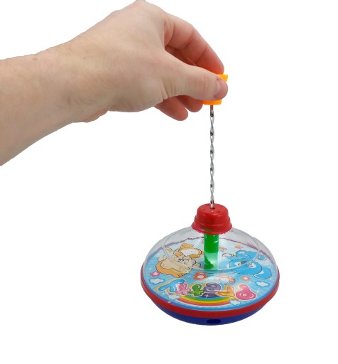 Zabawka bardzo prosta w obsłudze, należy nacisnąć tłok aby bączek zaczął wirować wokół własnej osi i obrazek na bączku mienił się kolorami.