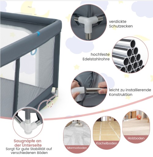 Nasz bardzo duży kojec dla niemowląt ma wymiary 200 x 180 x 68 cm, dzięki czemu dziecko może się swobodnie poruszać i brać udział w różnych aktywnościach. Posiada również 4 uchwyty, które zapewniają dziecku dodatkowe wsparcie podczas stania i chodzenia. Ponadto zawiera 50 kolorowych kulek oceanicznych, które stymulują zmysły i dodają zabawny element do zabawy. Co więcej, 4 boki są wyposażone w oddychające siatki, które umożliwiają doskonałą cyrkulację powietrza i zapewniają dziecku komfort podczas zabawy. Łatwy dostęp zapewniają 2 drzwiczki zapinane na zamek błyskawiczny. Wykonany z wysokiej jakości tkaniny Oxford i grubej pianki, zapewnia bezpieczną przestrzeń do aktywności dla dzieci.