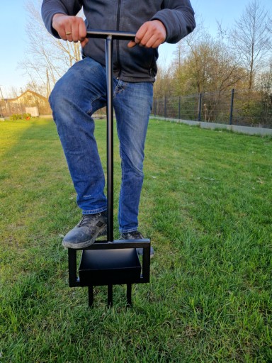 UWAGA: Ten model areatora należy wciskać w ziemię, NIE WBIJAĆ, ponieważ może to spowodować zapychanie. Przytknij do gleby i naciskając ciężarem ciała wepchnij aerator w ziemię.