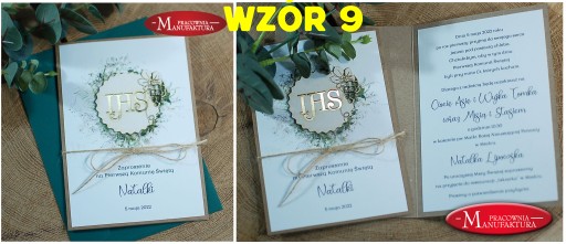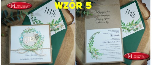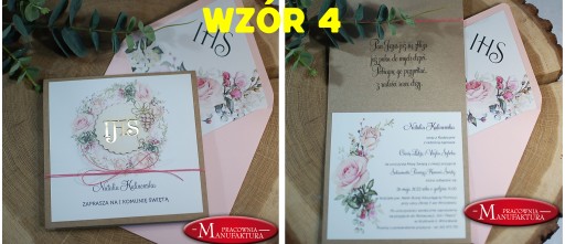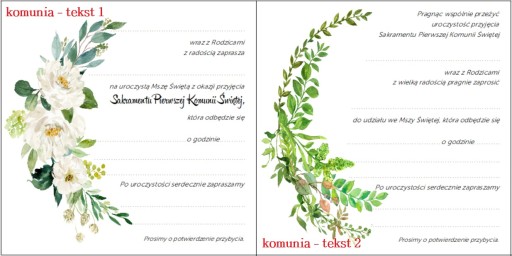 Przy zakupie poniżej 10 sztuk bez dokupienia personalizacji, personalizacja dotyczy wyłącznie strony głównej zaproszenia. Na końcu aukcji znajdują się do wyboru, teksty wewnętrzne do samodzielnego uzupełnienia. W tekście do wypełnienia zostanie zachowany motyw kwiatowy z wybranego wzoru.