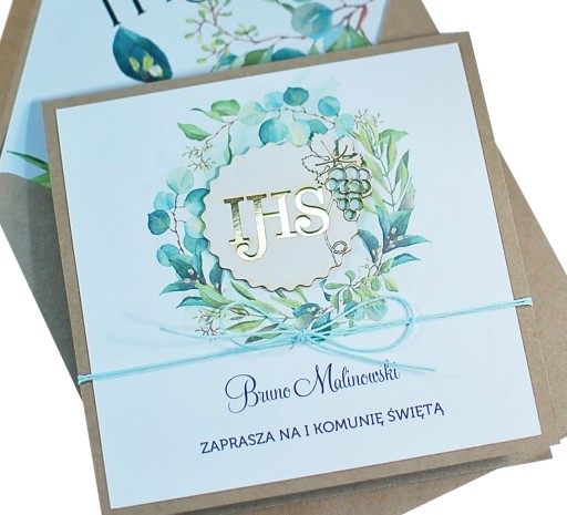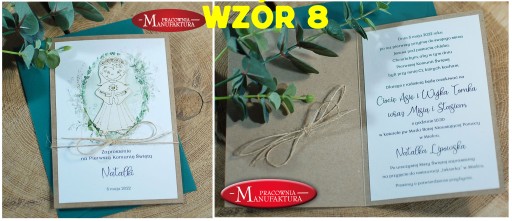 Rustykalne ręcznie wykonane zaproszenia na Pierwszą Komunię Świętą.