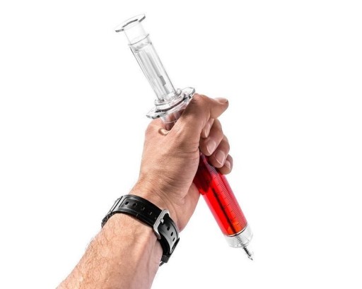 Świetny prezent i super gadżet, dzięki któremu nabierzesz nauczycieli i kolegów w szkole, czy koleżanki i kumpli z pracy, albo pasażerów w autobusie. Długopis do złudzenia przypomina strzykawkę wypełnioną krwią. Więc gdy już wszyscy ochłoną, po tym jak wyciągniesz strzykawkę z kieszeni czy torby i przyłożysz ja mimochodem do ręki, będziesz mógł im napisać: wyluzujcie, wkręciłem was.