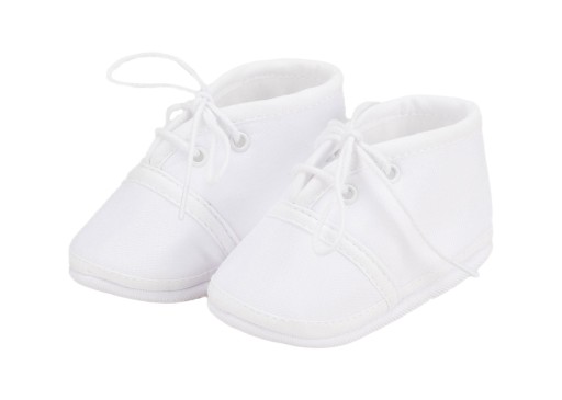 Białe buciki dla niemowlaczka. Wiązane na białe sznurówki.