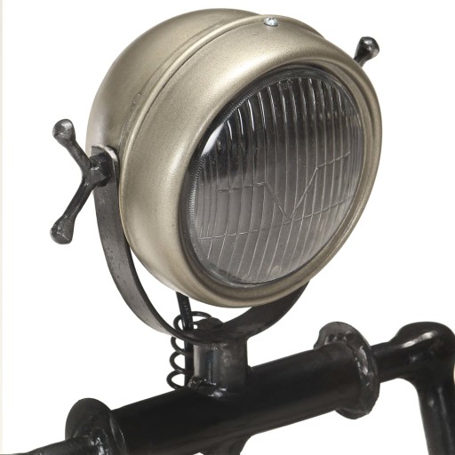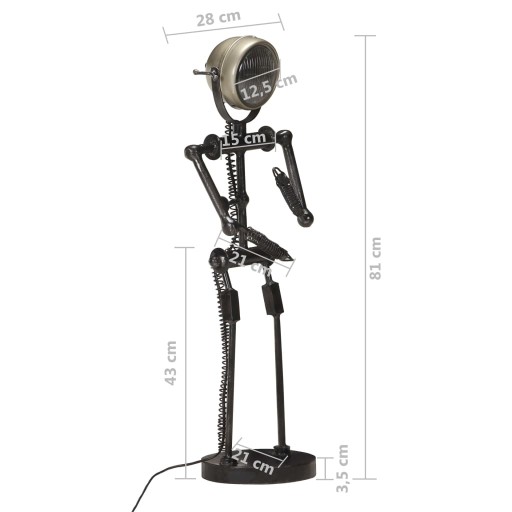 Rozświetl swoją przestrzeń życiową dzięki tej modnej lampie stojącej! Lampa podłogowa z korpusem w kształcie kukiełki i reflektorem motocyklowym w miejscu głowy z pewnością będzie przyciągać wzrok w każdym wnętrzu. Wykonana jest z żelaznej rury z recyklingu z wykończeniem malowanym natryskowo, dzięki czemu jest trwała i stabilna. Głowicę można obracać o 360°, aby spełnić Twoje specyficzne potrzeby. Prosimy mieć na uwadze: żarówka nie jest zawarta w dostawie.