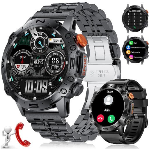 ten solidny smartwatch wojskowy ma 12 doskonałych certyfikatów: odporność na wstrząsy, ekstremalne temperatury, wodoodporność IP68, pyłoszczelność itp. Solidna stalowa bransoleta i składane zapięcie zabezpieczające są wykonane ze stali nierdzewnej 304 i unikalnej metalowej obudowy i kompozytowa konstrukcja zapewniają trwałość.