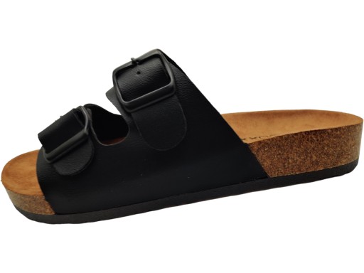 Czarne klapki z klamrą dla kobiet, wykonane z wysokiej jakości materiałów. Doskonale sprawdzą się na co dzień. Ich lekka konstrukcja gwarantuje komfort noszenia, a solidna podeszwa zapewnia stabilność i amortyzację dla stóp. Ten modny, klasyczny design doskonale współgra z różnymi stylizacjami, dodając im wyjątkowego uroku. Poza tym świetnie prezentują się na stopie!