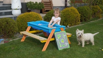 Multi-funkcjonalny stolik piknikowy dla dzieci, który pozwoli na wygodne i przyjemne spędzenie czasu na świeżym powietrzu.