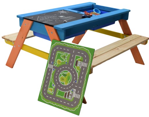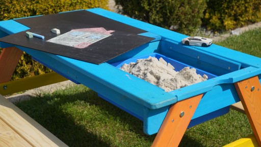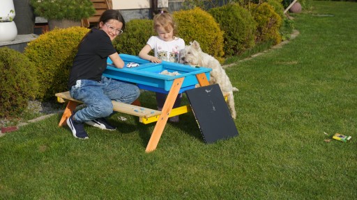 ✔️ Pod blatem stołu znajdują się dwa niebieskie plastikowe pojemniki, które można wypełnić piaskiem lub wodą, można tam trzymać również zabawki.