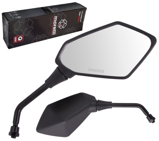 Czarne matowe lusterka o nowoczesnym designie. Mocowane są na solidnym metalowym uchwycie o średnicy gwintu 10 mm. Posiadają możliwość przegubowej regulacji kąta widzenia, dzięki której możliwe jest indywidualne dopasowanie ustawień do własnych potrzeb. Wyposażone są w otwory umożliwiające odprowadzanie wody.