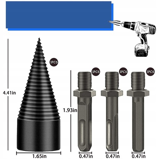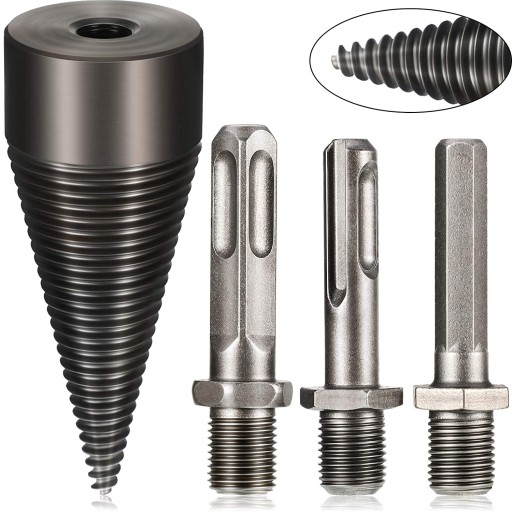 3 rodzaje wierteł: 1 łuparka do drewna 42mm + 1 uchwyt kwadratowy + 1 uchwyt okrągły + 1 uchwyt sześciokątny. Wydajne narzędzia do ścinania i otwierania drewna w celu szybkiego oddzielania kłód i zwiększania produktywności. Długość całkowita: 16 cm, długość wiertła: 11 cm