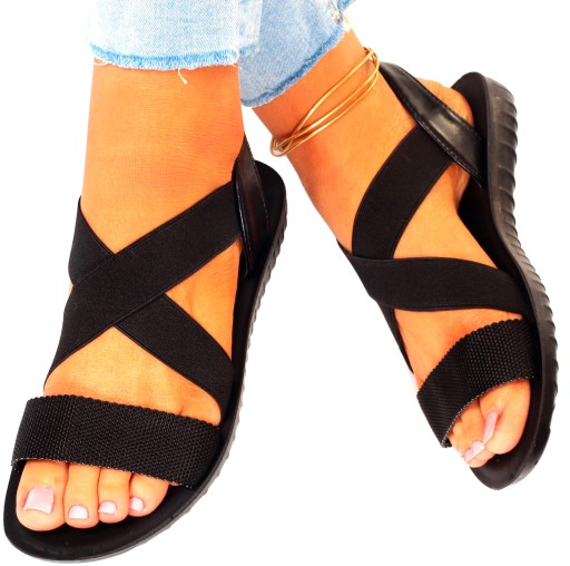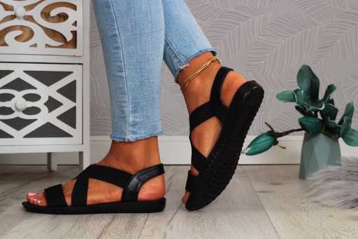 Damskie sandałki w kolorze czarnym na płaskiej podeszwie. Idealnie sprawdzą się jako obuwie na co dzień w letnie, upalne dni. Elastyczny pasek przy kostce oraz śródstopiu ułatwia zakładanie obuwia i ułatwia jego dopasowanie do stopy.