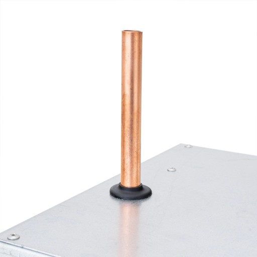 - Materiał: Obudowa z blachy stalowej ocynkowanej, wężownica i rury przyłączeniowe z miedzi, lamele z aluminium