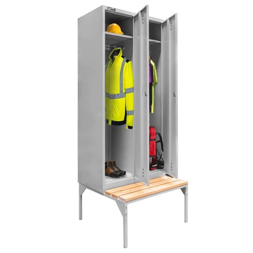 Ławeczka pod szafkę BHP marki Mega-M o wymiarach 60x80x43 cm to idealne uzupełnienie zapewniające wysoki komfort i wygodę użytkowania. Stelaż z nogami do montażu pod szafą zapewnia miejsce do siedzenia w szatni oraz dodatkową przestrzeń pod szafką, np. do przechowywania obuwia.