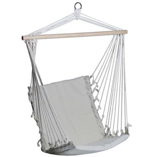 Krzesło brazylijskie w kolorze ecru jest doskonałą alternatywą dla tradycyjnego hamaka, a równie przyjemnie można się na nim zrelaksować.