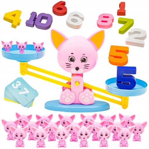 Spójrz, jakie wspaniałości kryje ta zabawka: kolorowa waga szalkowa z figurką kotka, odważniki w kształcie małych kotków, cyfry i karty z zadaniami zapewnią Ci długie godziny ciekawej zabawy, która doprowadzi Cię do fascynujących odkryć!