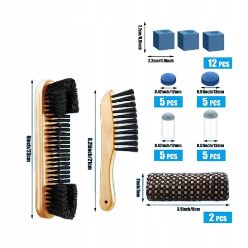[Właściwy rozmiar] szczotka stołu bilardowego ma 9 cali, szczotka szyny bilardowej ma 8,25 cala, ściereczka do wycierania kija bilardowego ma 3,5 cala, kostki kredy cue to 0,9 cala, poślizg na końcówce kija bilardowego to 0,47 cala, 0,51 cala, niebieskie końcówki cue to 0,47 cala, 0,51 cala.