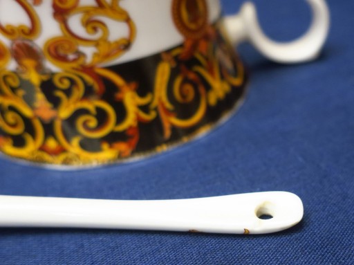 Stan: łyżeczka ma małe wyszczerbienie przy rączce, filiżanka bez defektów