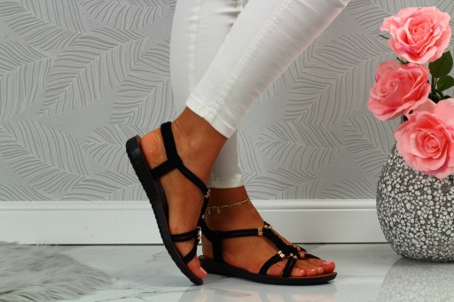 Damskie sandałki w kolorze czarnym na płaskim spodzie. Idealnie sprawdzą się jako obuwie na co dzień w letnie, upalne dni. Prosty fason dopasuje się również do eleganckich stylizacji a ozdobne, złote koraliki dodadzą uroku każdej stylizacji. Elastyczny pasek przy pięcie ułatwia zakładanie obuwia i ułatwia jego dopasowanie do stopy.