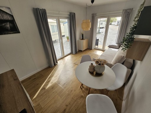 * Posiada przestronny salon z dwoma podwójnymi drzwiami tarasowymi które zapewniają dostęp do tarasu z możliwością jego rozbudowania
